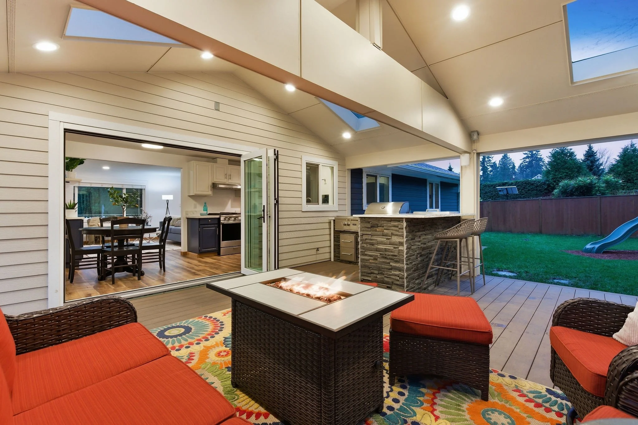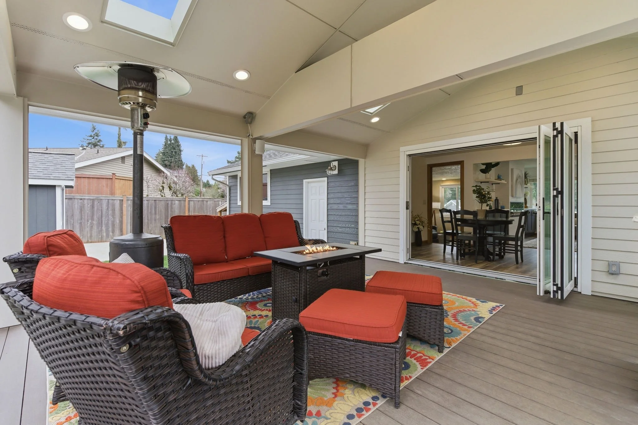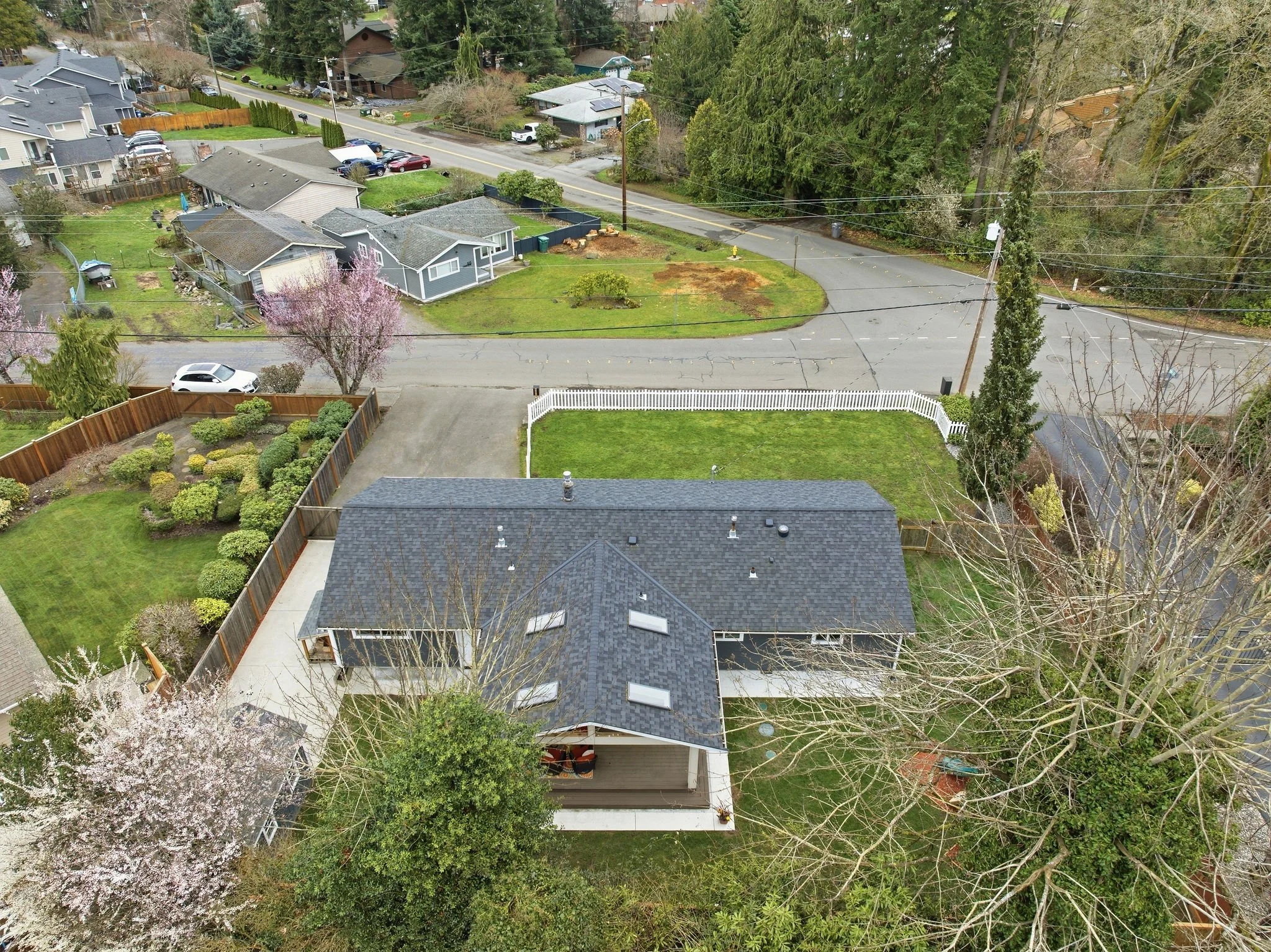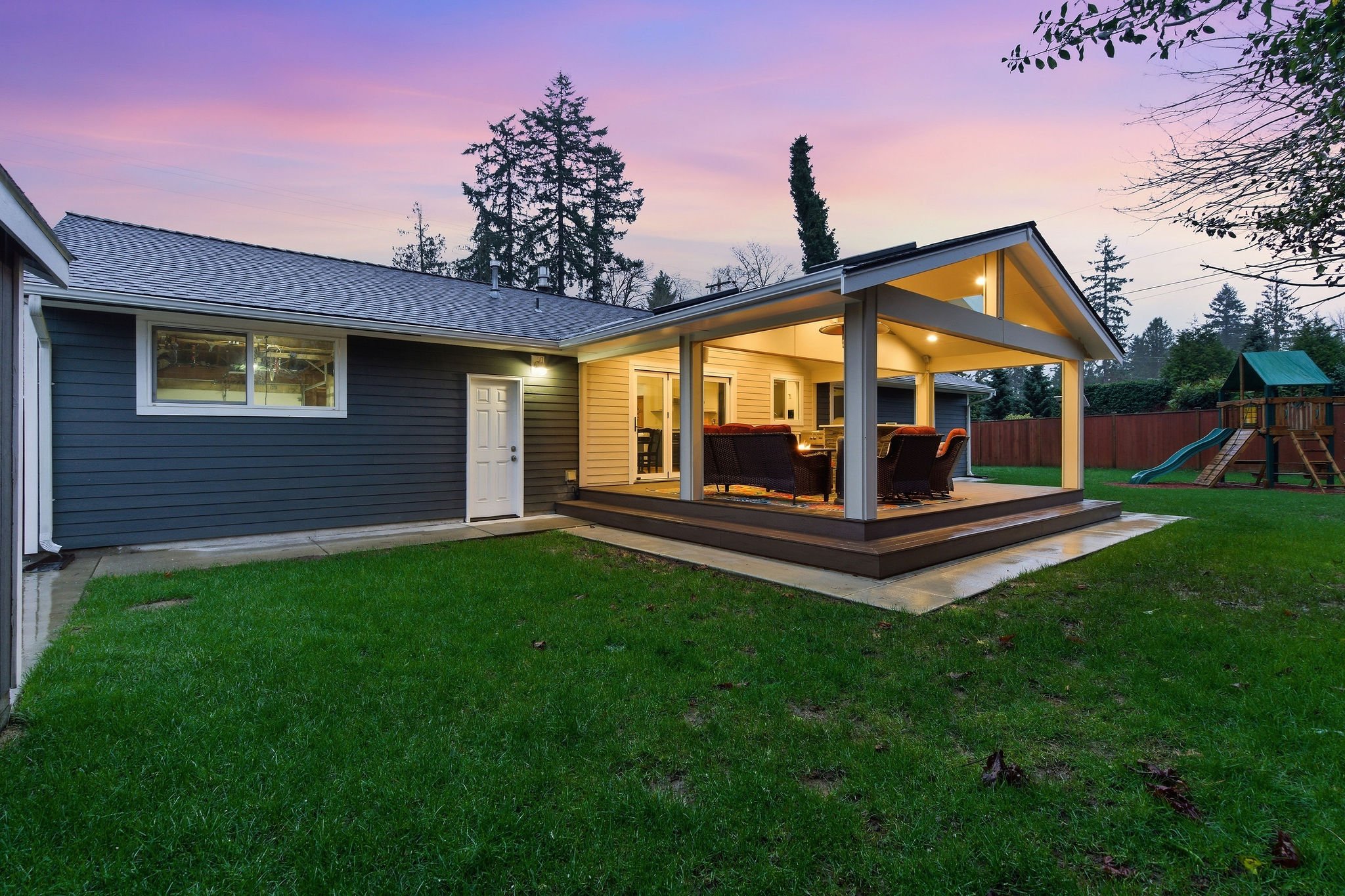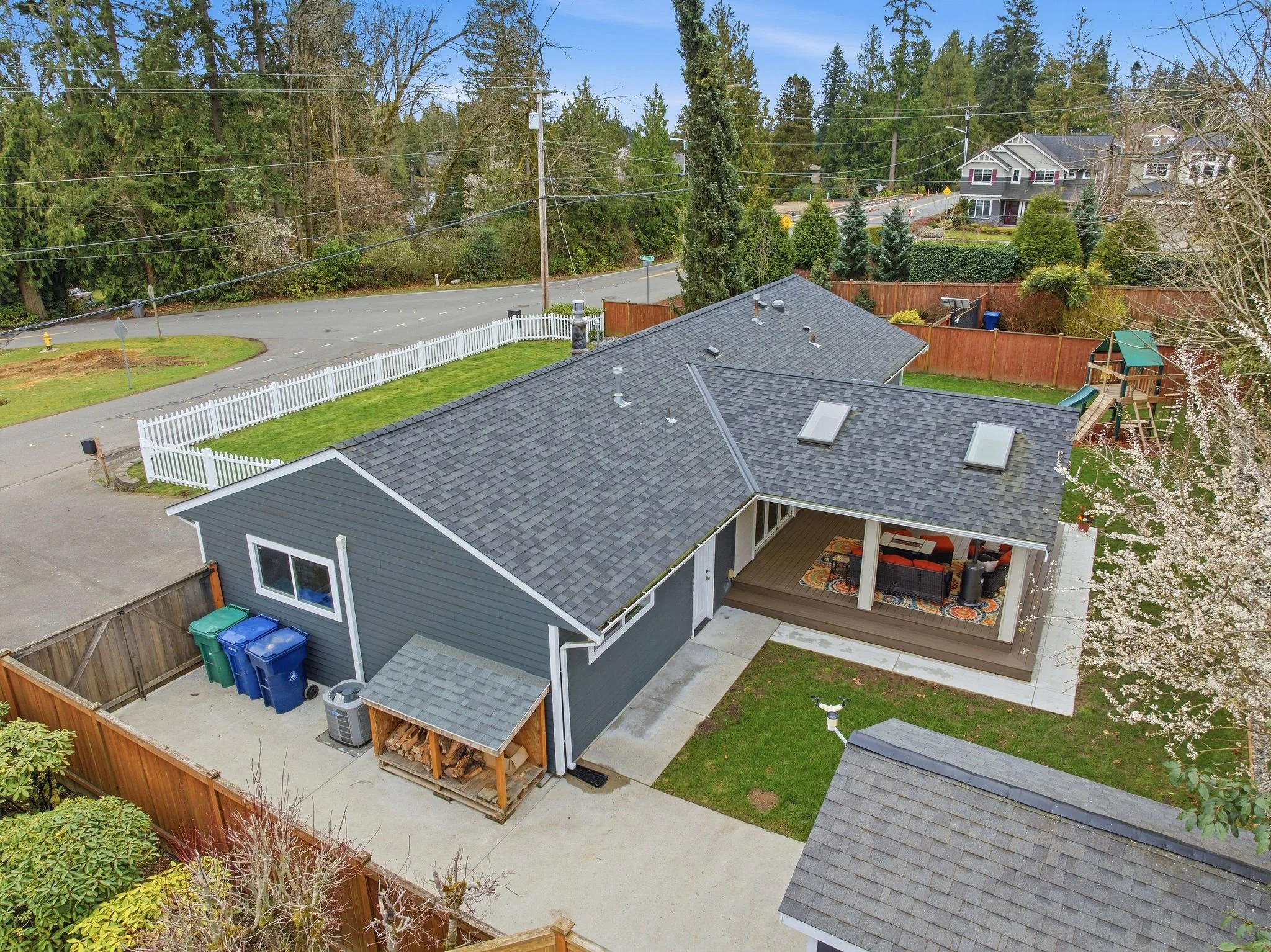 Indoor-outdoor living at its best. A wall of folding glass opens the kitchen and dining area to a covered outdoor kitchen and entertaining deck, creating seamless indoor-outdoor living and a true entertainer’s setting. This thoughtfully updated home lives larger than its footprint and offers numerous upgrades throughout. The kitchen features new quartz countertops, refreshed cabinetry and hardware, stainless steel appliances including a gas cooktop with convection oven, and durable LVP flooring throughout. The inviting family room showcases a custom electric fireplace with flanking cabinetry and quartz top. Outdoor living shines with a covered outdoor kitchen, natural gas grill and griddle, built-in recycling and trash pull-outs, and wiring in place for a patio heater. The fully fenced yard offers a level and private setting with new sod, updated fencing, and usable outdoor space. Exterior improvements include Hardie-board siding, triple-pane windows, asphalt driveway, storage shed, and gated RV or boat parking. Extra finished space adjacent to the garage offers flexibility for office, workout room, media room, or hobbies. Major updates include roof, air conditioning, water heater, crawlspace and attic insulation, and septic lids. Property currently served by septic with city sewer stub available at the front of the lot per seller documentation. Convenient access to I-5, I-405, Mill Creek, and Lynnwood. Enjoy nearby Martha Lake Airport Park, just a short walk away with a dog park, playground, skate park, and open green space.