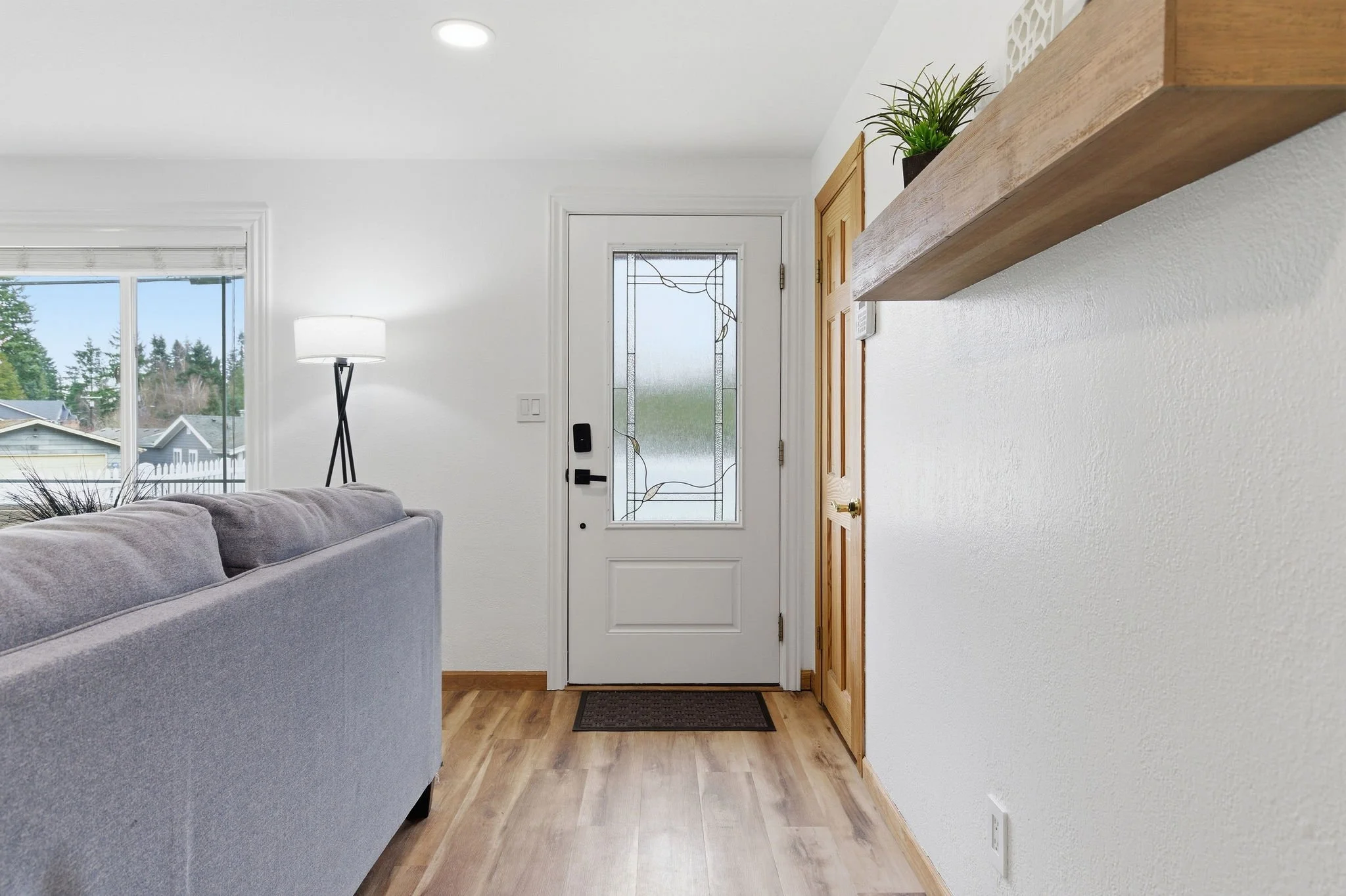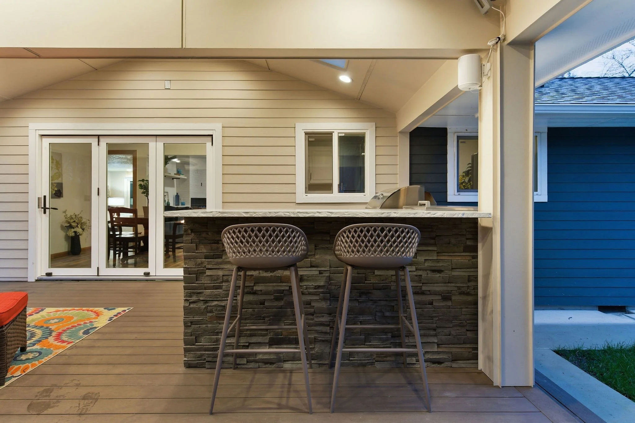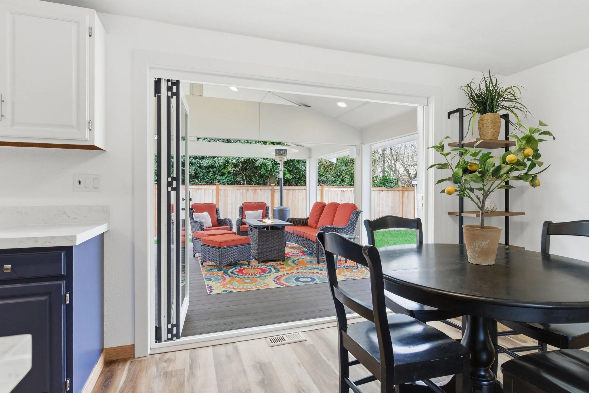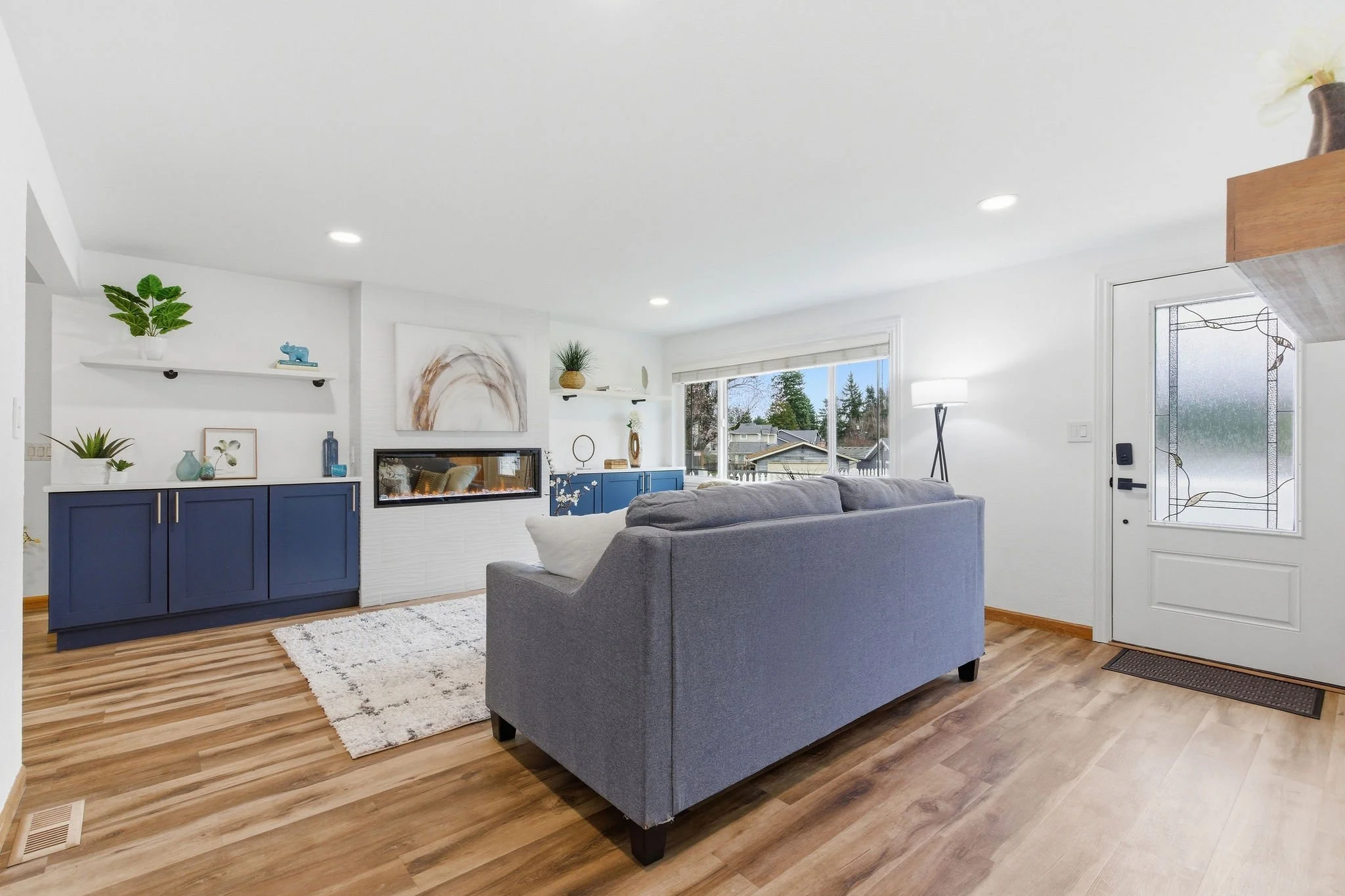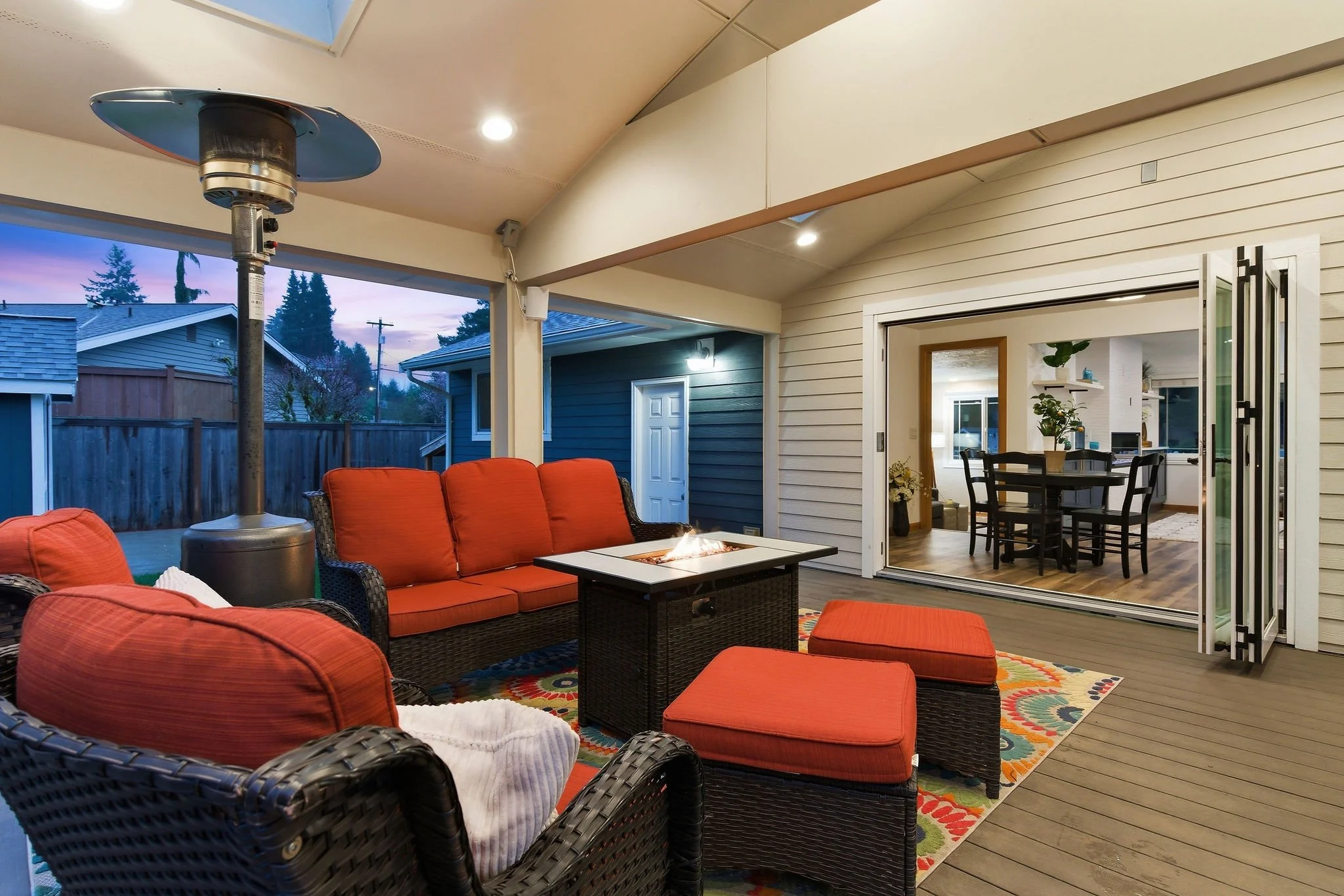 Indoor-outdoor living at its best. A wall of folding glass opens the kitchen and dining area to a covered outdoor kitchen and entertaining deck, creating seamless indoor-outdoor living and a true entertainer’s setting. This thoughtfully updated home lives larger than its footprint and offers numerous upgrades throughout. The kitchen features new quartz countertops, refreshed cabinetry and hardware, stainless steel appliances including a gas cooktop with convection oven, and durable LVP flooring throughout. The inviting family room showcases a custom electric fireplace with flanking cabinetry and quartz top. Outdoor living shines with a covered outdoor kitchen, natural gas grill and griddle, built-in recycling and trash pull-outs, and wiring in place for a patio heater. The fully fenced yard offers a level and private setting with new sod, updated fencing, and usable outdoor space. Exterior improvements include Hardie-board siding, triple-pane windows, asphalt driveway, storage shed, and gated RV or boat parking. Extra finished space adjacent to the garage offers flexibility for office, workout room, media room, or hobbies. Major updates include roof, air conditioning, water heater, crawlspace and attic insulation, and septic lids. Property currently served by septic with city sewer stub available at the front of the lot per seller documentation. Convenient access to I-5, I-405, Mill Creek, and Lynnwood. Enjoy nearby Martha Lake Airport Park, just a short walk away with a dog park, playground, skate park, and open green space.